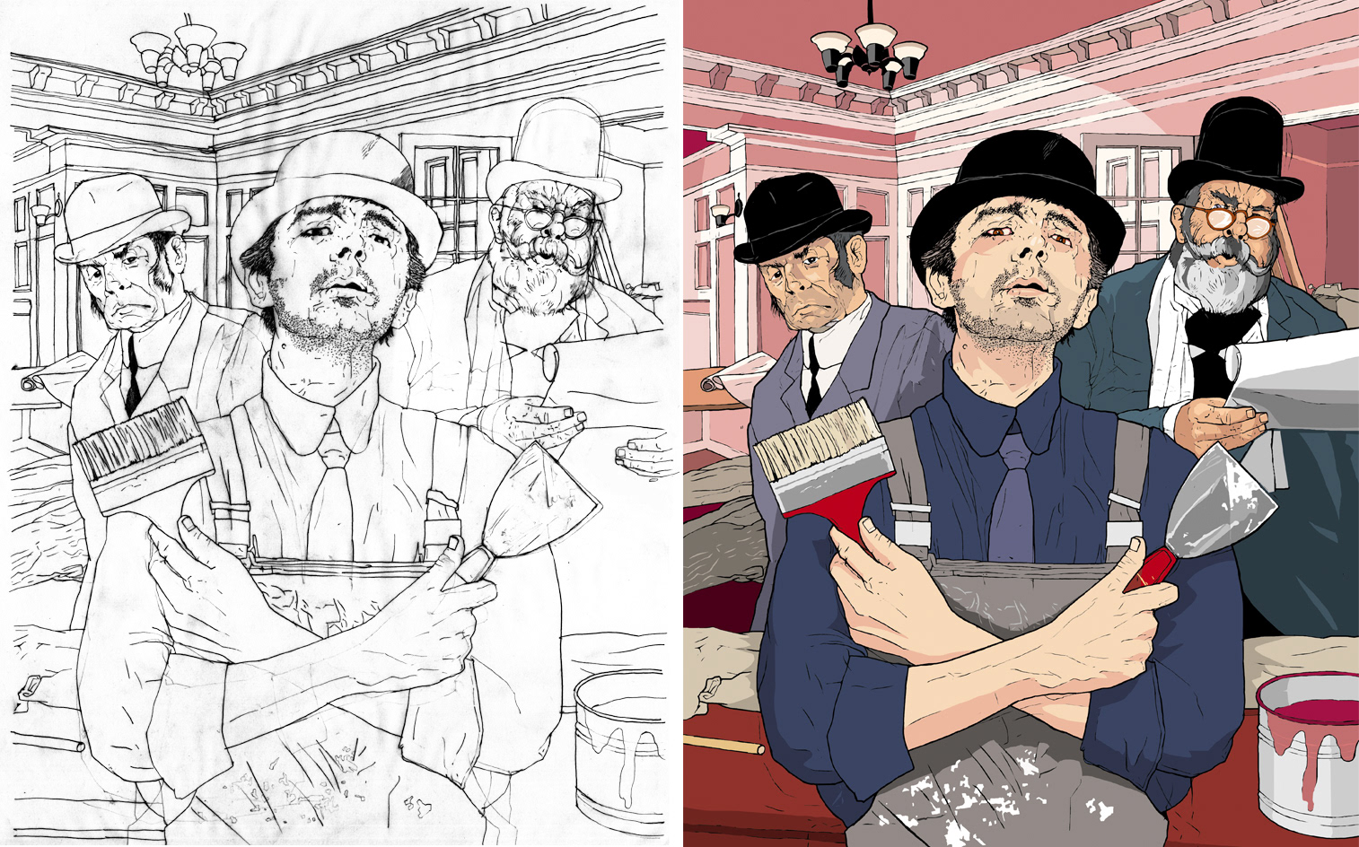 The Ragged Trousered Philanthropists is known as a masterpiece of wit and political passion, one of the most authentic novels of English working class life ever written, but it was Owen's forbearance rather than his radicalism which moved me. His capacity for suffering is almost masochistic; I set out to depict him with an emaciated Christ-like aura as he endures the harrassment and intimidation of his overseer (left) and employer (right).