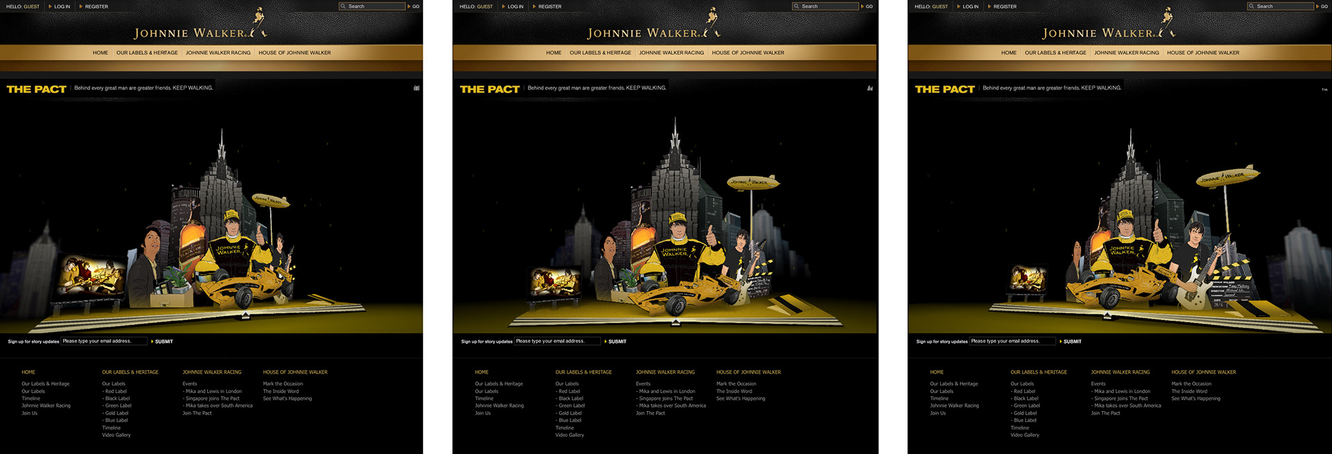 'The Pact Between Men' was an aspirational mini site within Johnnie Walker's Asia Pacific website, tracking the progress of four friends walking the path to greatness together. OgilvyOne Beijing commissioned me to produce 20+ skins, which formed a series of integrated scenes that built into 3D navigational pop-up books.