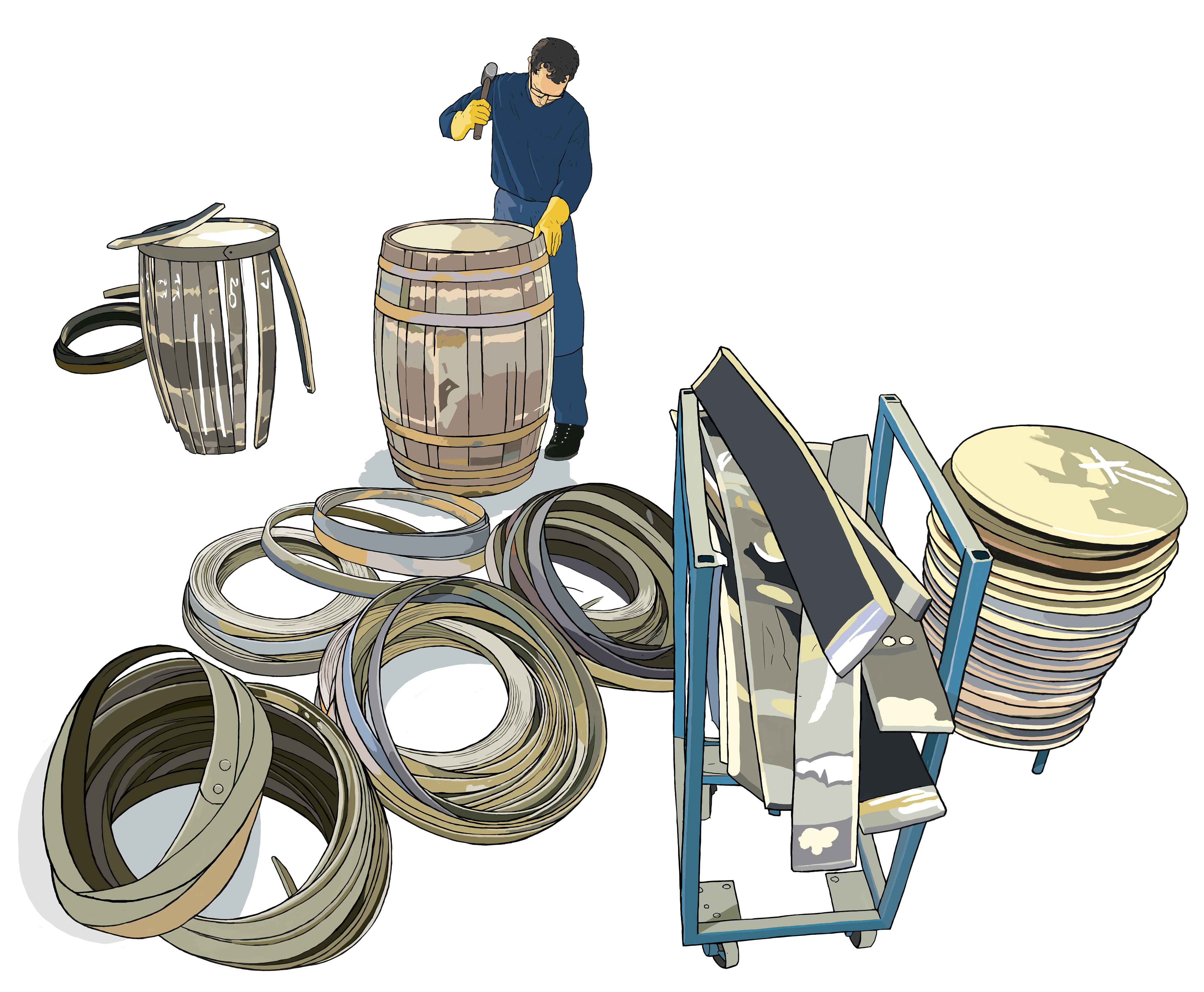 The smooth vanilla notes of Monkey Shoulder come from the oak barrels in which it is stored. Bourbon casks are shipped over from the US and repaired on-site at William Grant's cooperage. In this illustration I've tried to capture the hot hard reality of a physically demanding and highly skilled process.